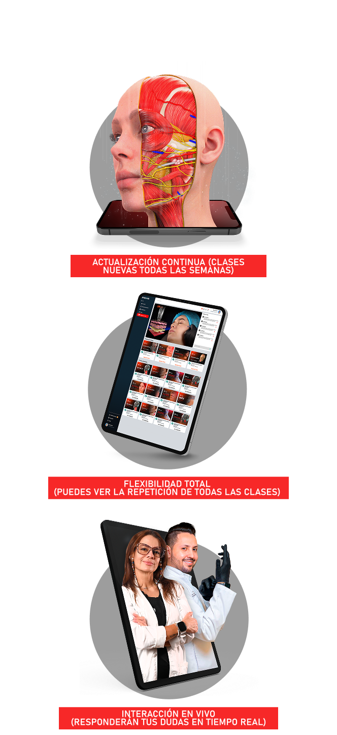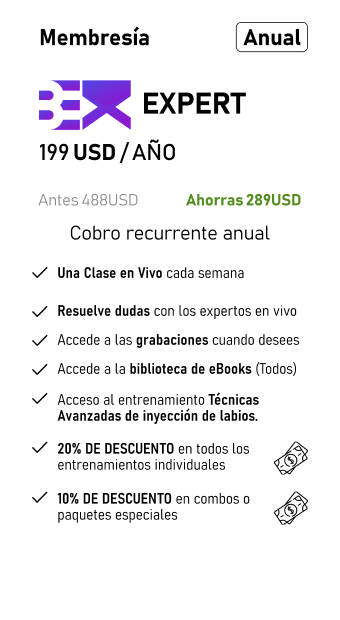 La membresía anual incluye todos los beneficios de la membresía mensual, más acceso a la biblioteca completa de eBooks, al entrenamiento "Técnicas Avanzadas de Inyección de Labios del Dr. Massimiliano Leporati" valorado en 200 USD, un 20% de descuento en entrenamientos individuales pregrabados y un 10% de descuento en combos o paquetes especiales.